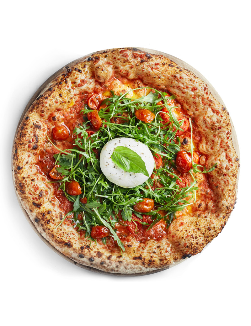 Sauce tomate, mozza, tomates cerises, roquette, burrata, basilic, huile d'olive extra vierge