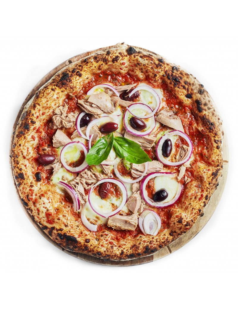 Sauce tomate, mozza, thon, oignons rouges, olives noires, basilic
