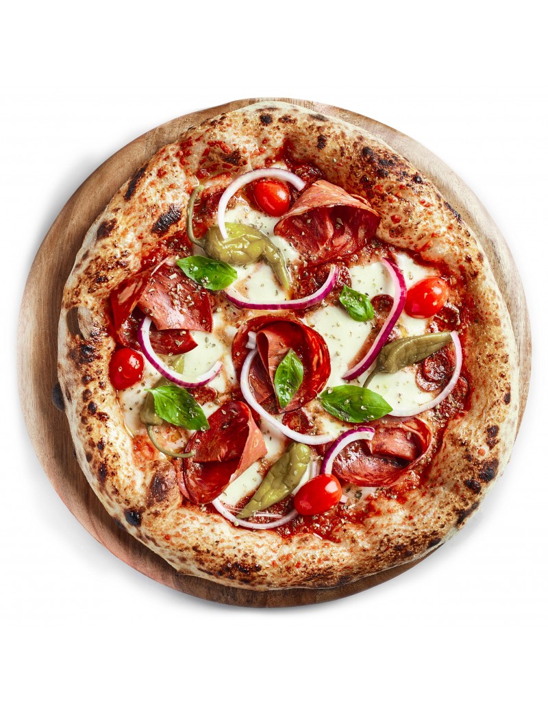 Sauce tomate, mozza, chorizo de boeuf, merguez du boucher, oignons rouges et piments vinaigrés