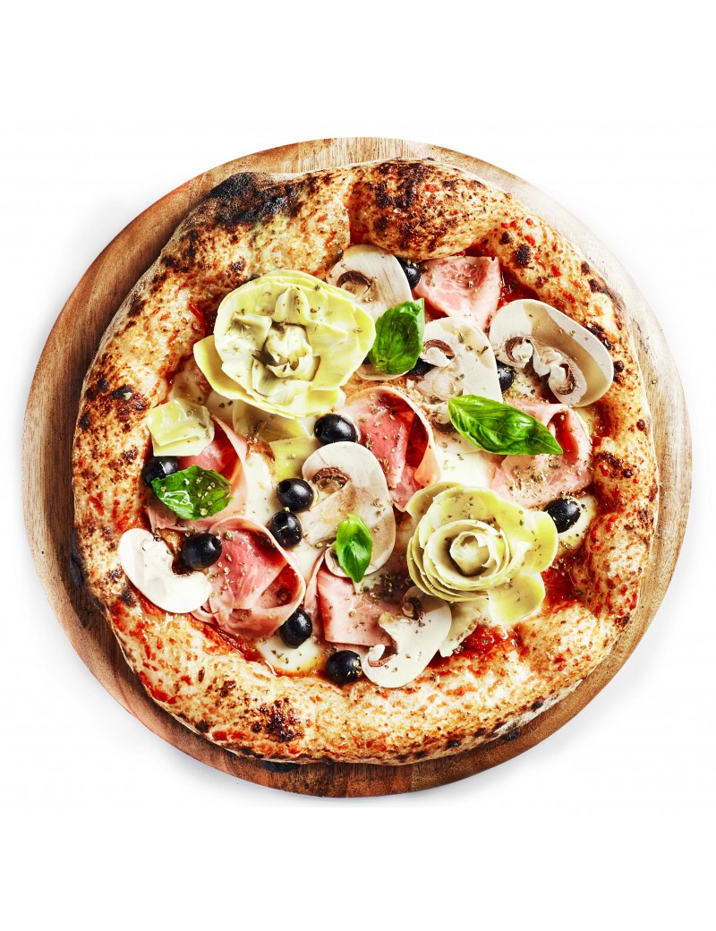 Sauce tomate, mozzarella, jambon de dinde, champignons, artichauts marinés et olives noires